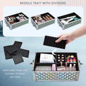 - 【Large capacity Middle Tray】: The middle tray is ingeniously matched with the detachable baffle. According to gadgets of different sizes, space can be arranged, not only the items are placed neatly, but also can be fixed to prevent shaking and falling damage. It is very suitable for professional makeup artists, manicurists, hairstylists, beauticians, nail tech students, tattoo artists or people who have a lot of cosmetics.
